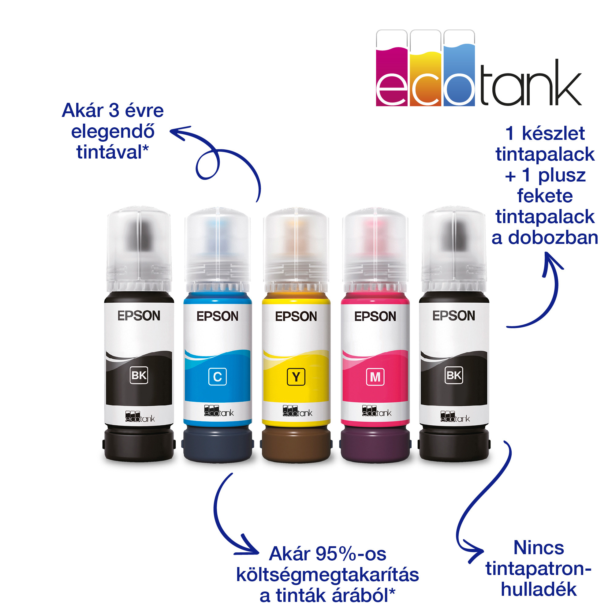 - A doboz tartalma: 4 db 65 ml-es, színenként cserélhető tintapalack (Bk,C,Y,M) + 1 db extra fekete tintapalack, Készülék, Tápkábel, Beállítási utasítás, Garancia dokumentum
