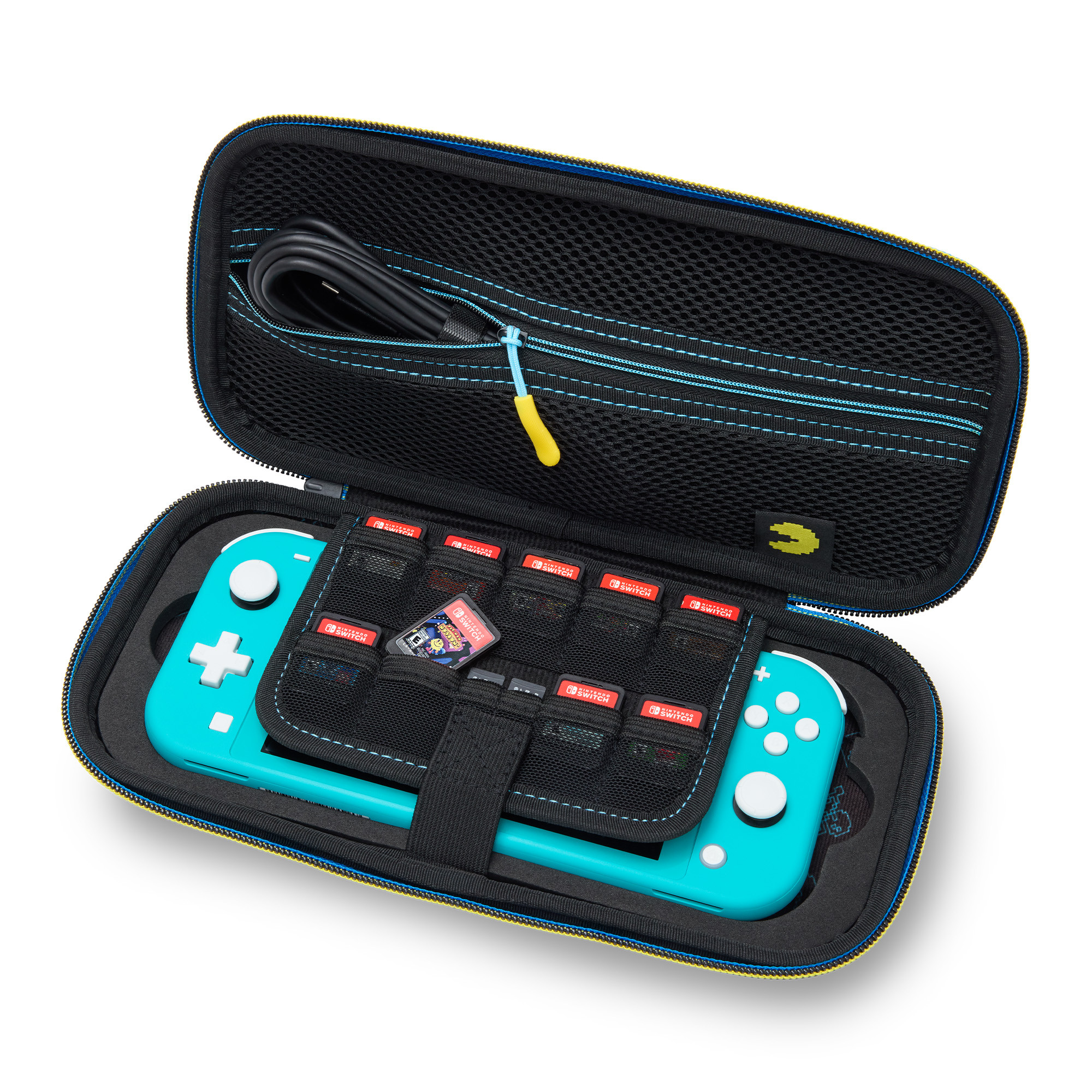 Vidd magaddal Nintendo Switch OLED, Nintendo Switch vagy Switch Lite készüléked az útra ezzel az igazán stílusos masszív védőtokkal. Puha belső borítással, kijelzővédelemmel és kilenc játékkártyatartó zsebbel. A géped mindig biztonságban lesz és gondtalanul élvezheted a játékot bárhol, bármikor. Strapabíró merev külső burkolat gumírozott fogóval és cipzáros záródással