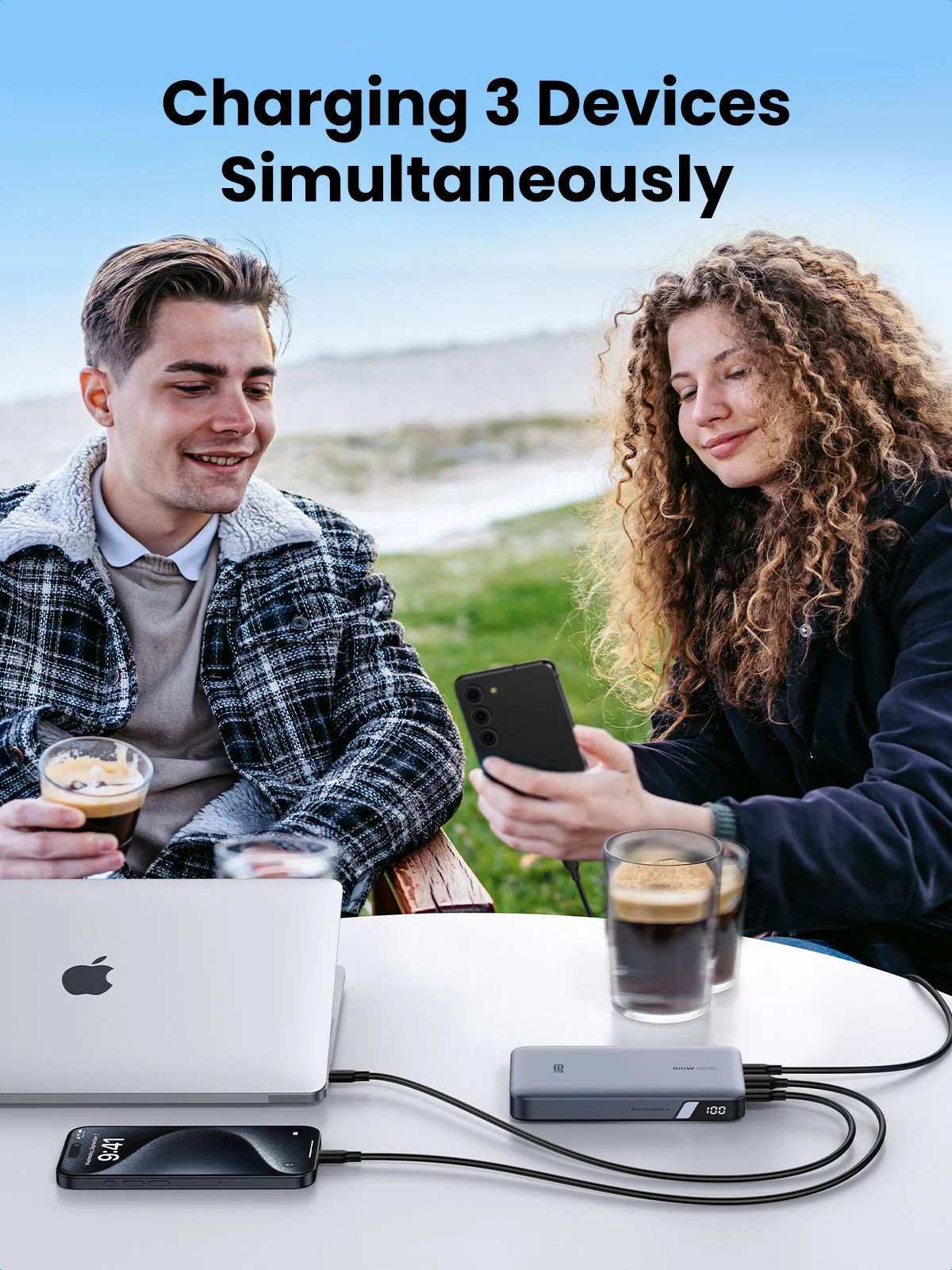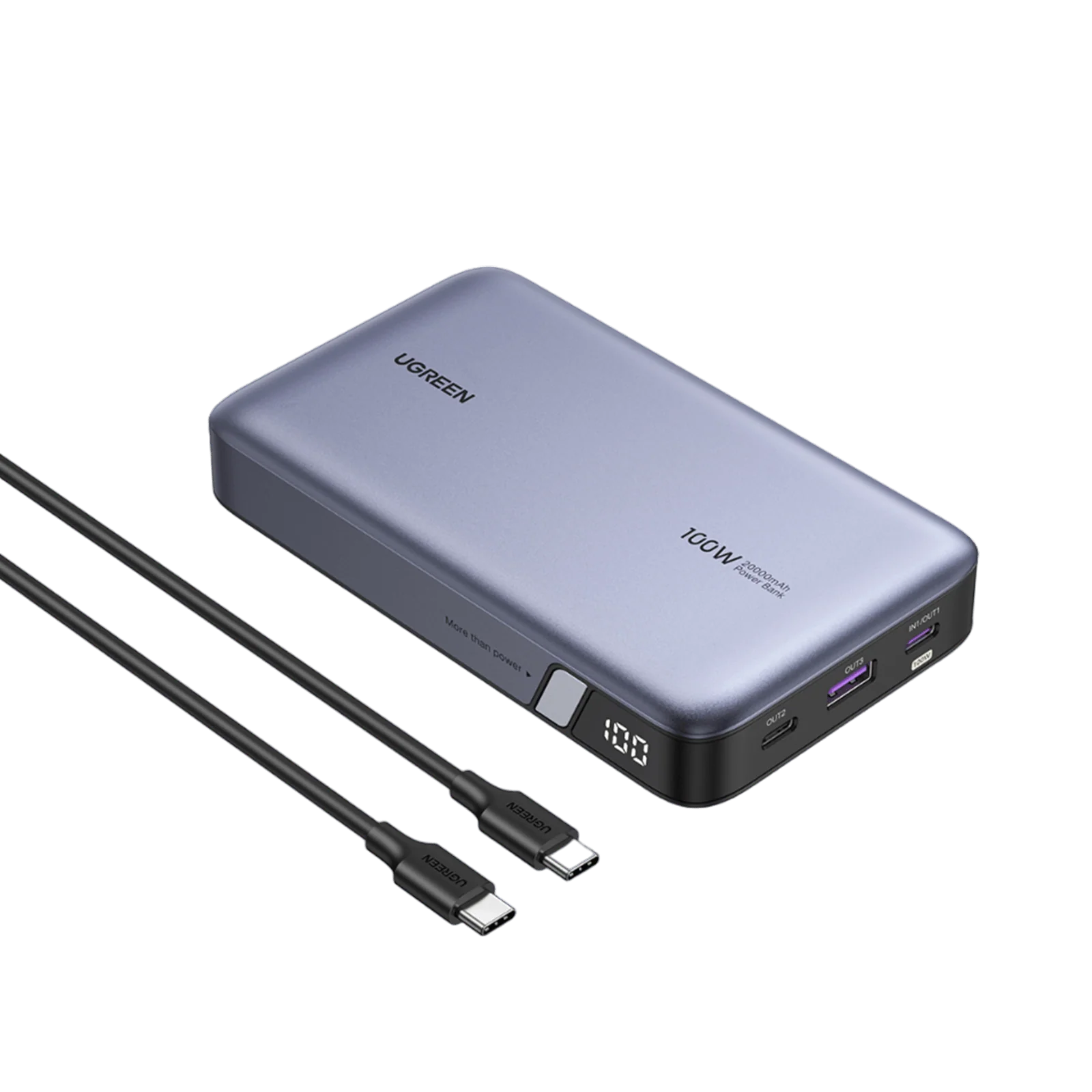 - Portok: 2× USB-C + 1× USB-A
